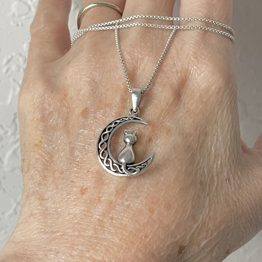 925 Sterling Silver Cat on Crescent Moon Necklace – Dainty Kitten Pendant, Celestial Silver Chain Jewelry