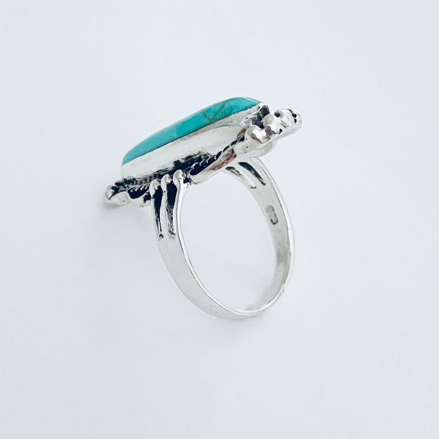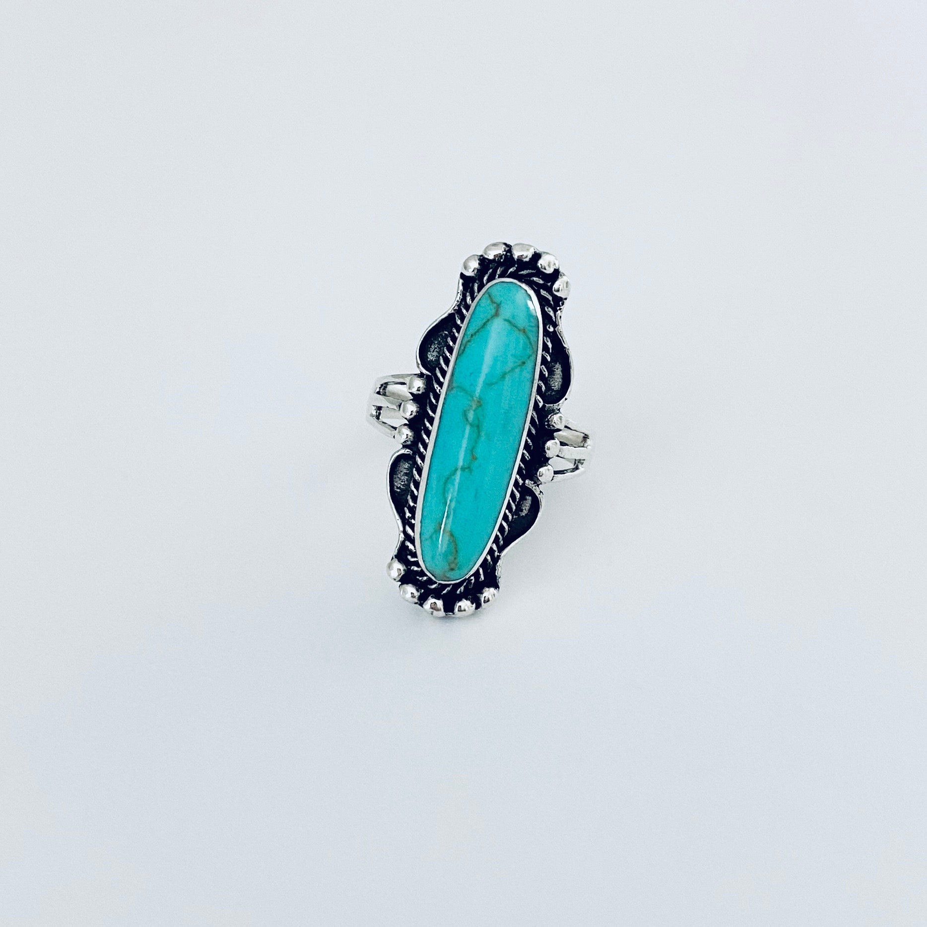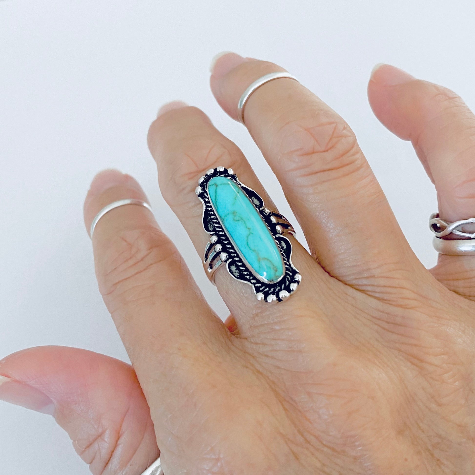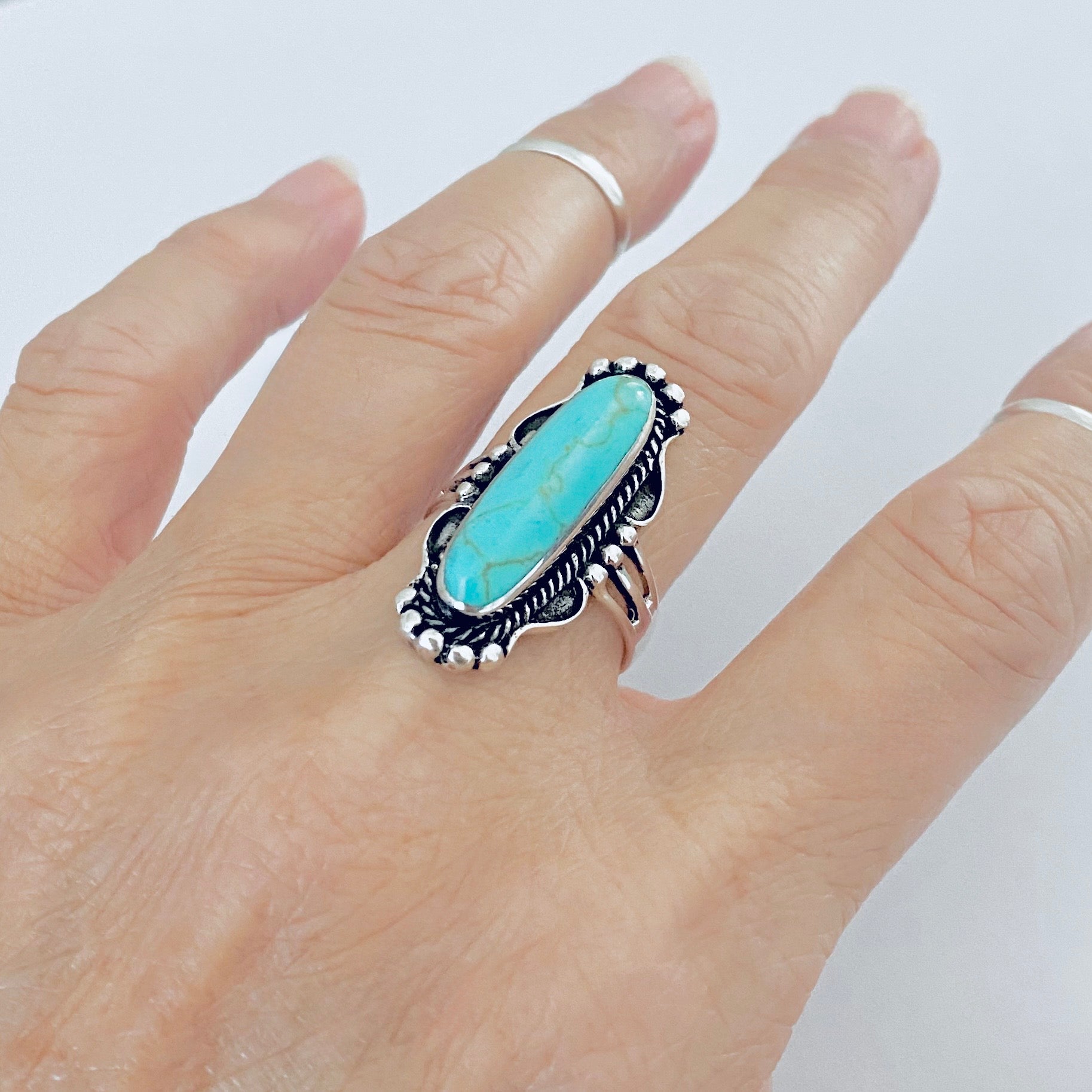 Sterling Silver Statement Long Oval Synthetic Turquoise Ring, Boho Rings, Turquoise Stone Jewelry, 925 Stamped