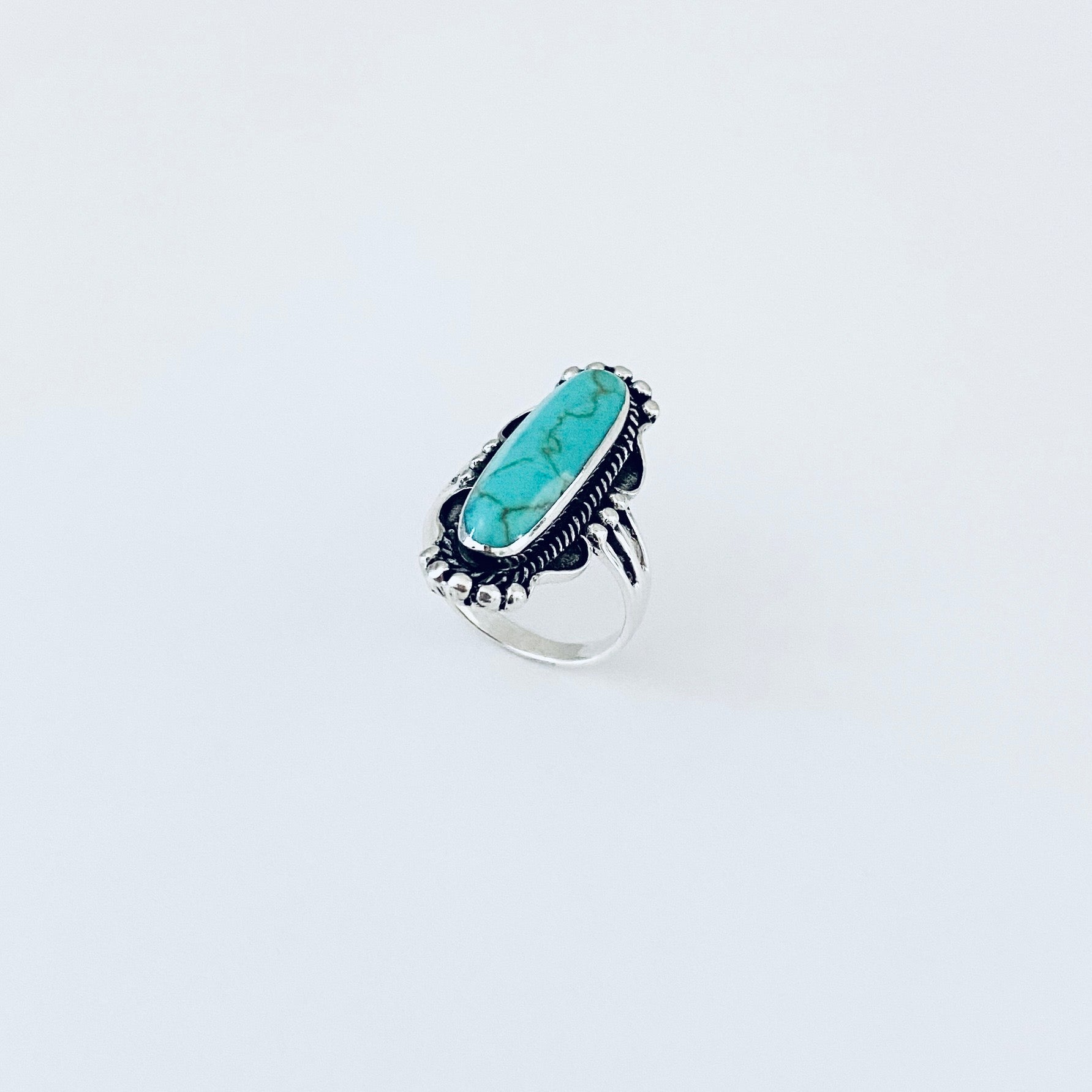 Sterling Silver Long Oval Synthetic Turquoise Ring, Statement Boho Stone Jewelry