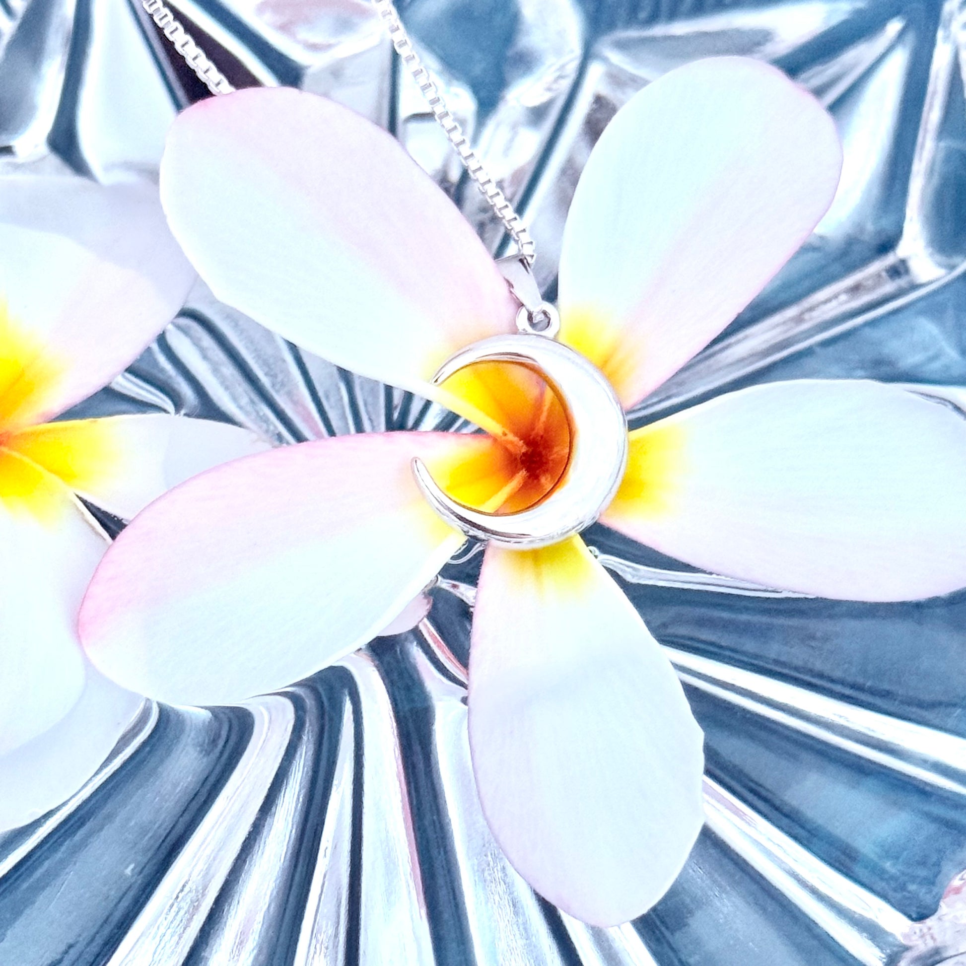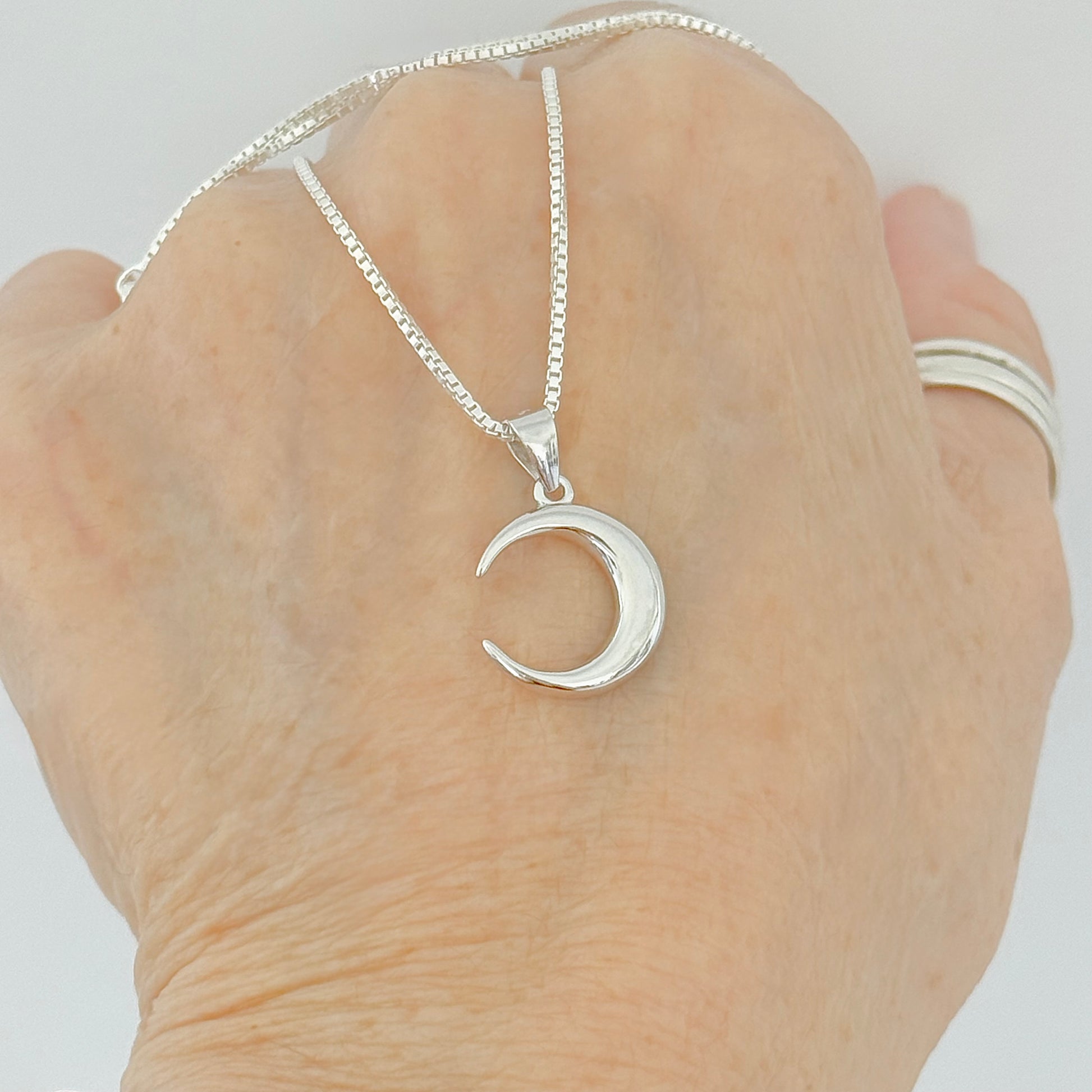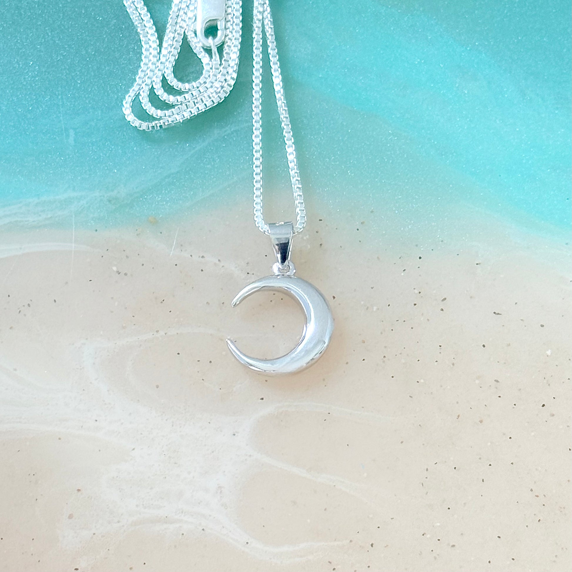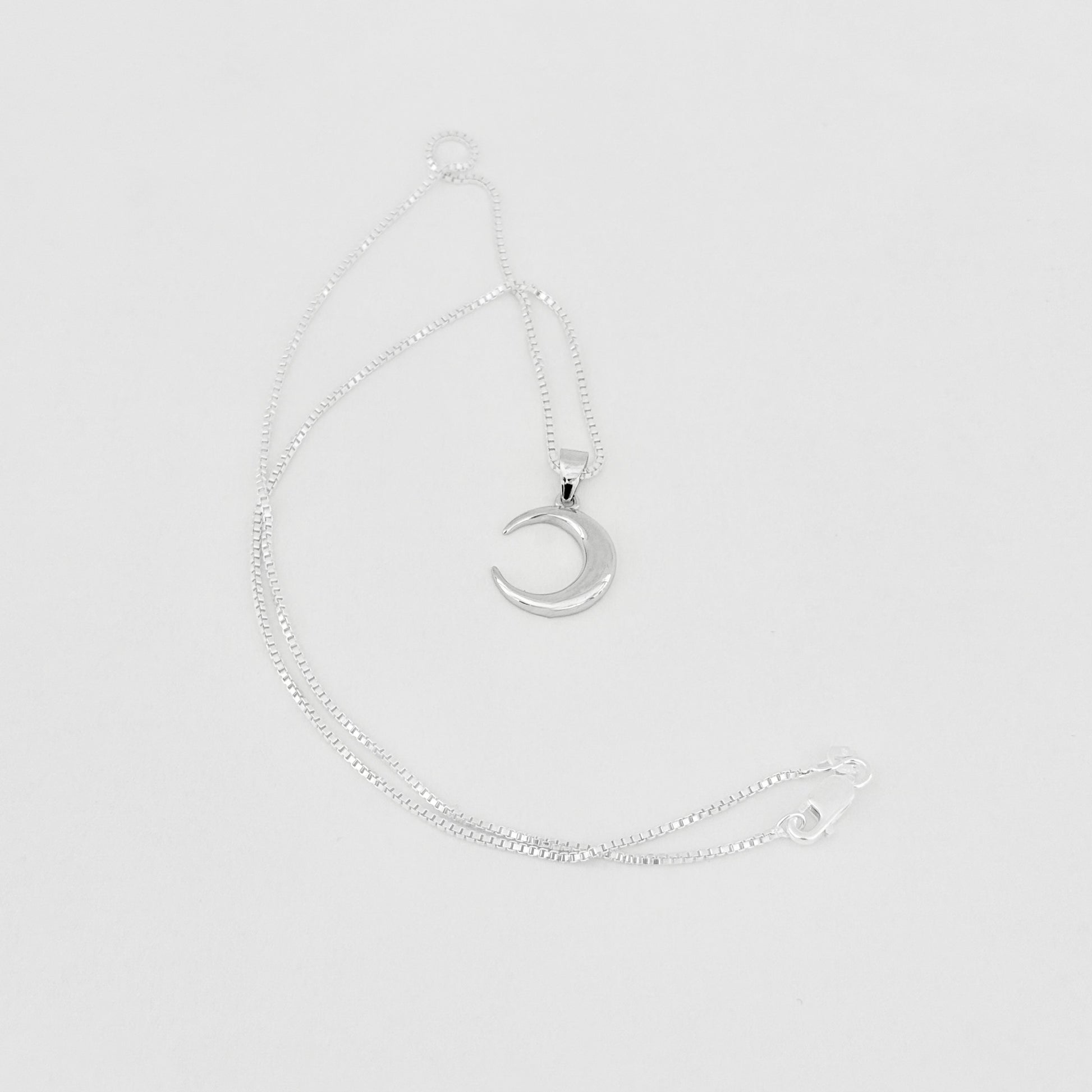 This elegant crescent moon pendant necklace comes with a durable Italian box chain, available in multiple lengths for a perfect personalized fit. The necklace is rhodium plated for long-lasting shine and tarnish resistance, making it ideal for everyday wear or special occasions.