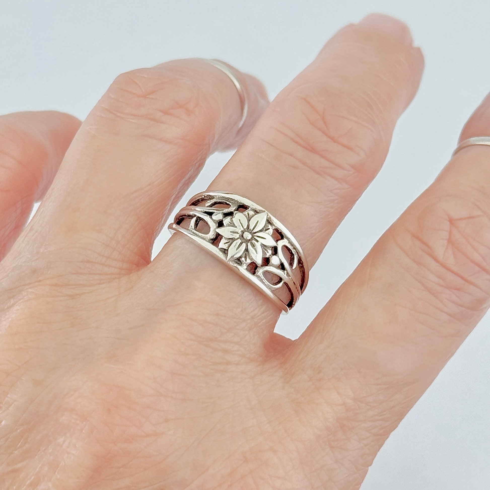 Make a bold, victorina statement with this Sterling Silver Star Flow Ring with Swirls. Crafted from 925 sterling silver, this dainty ring features a beautifully detailed Star Flower design, perfect for adding a touch of floral elegance to any outfit. Ideal for boho-inspired looks or as a standout accessory for special occasions.
