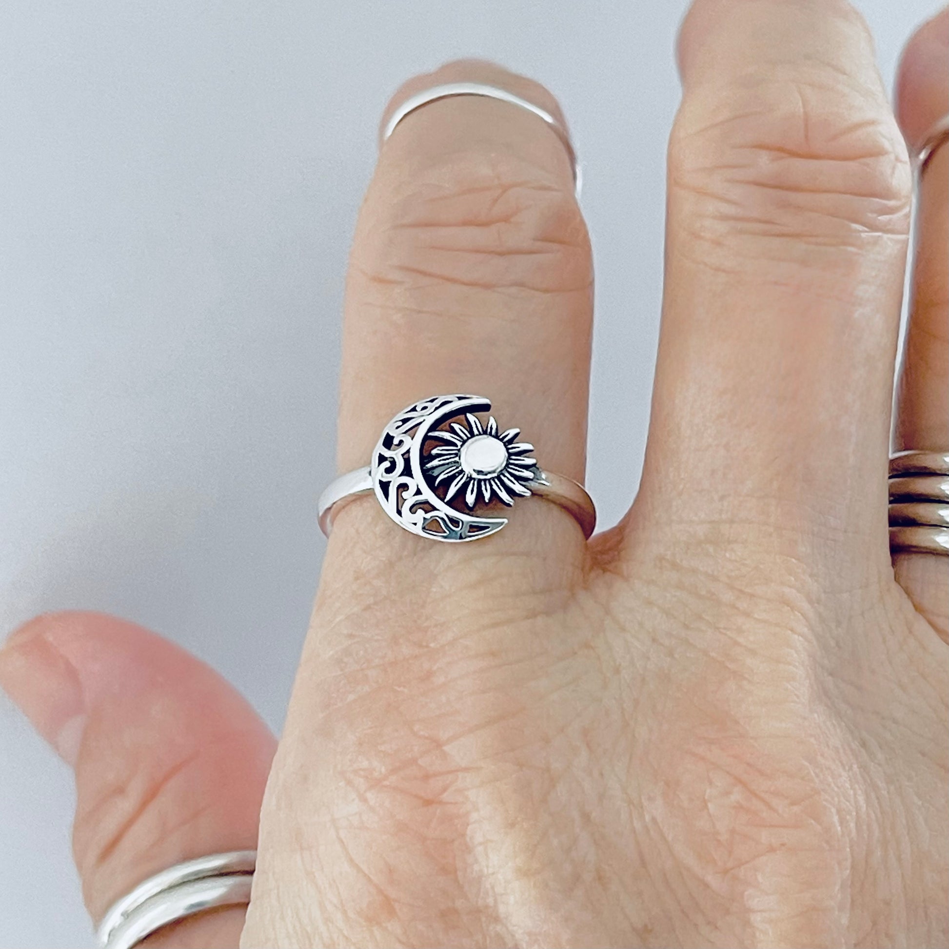 Sterling Silver Filigree Crescent Moon and Sun Ring, Celestial Rings, Sunshine