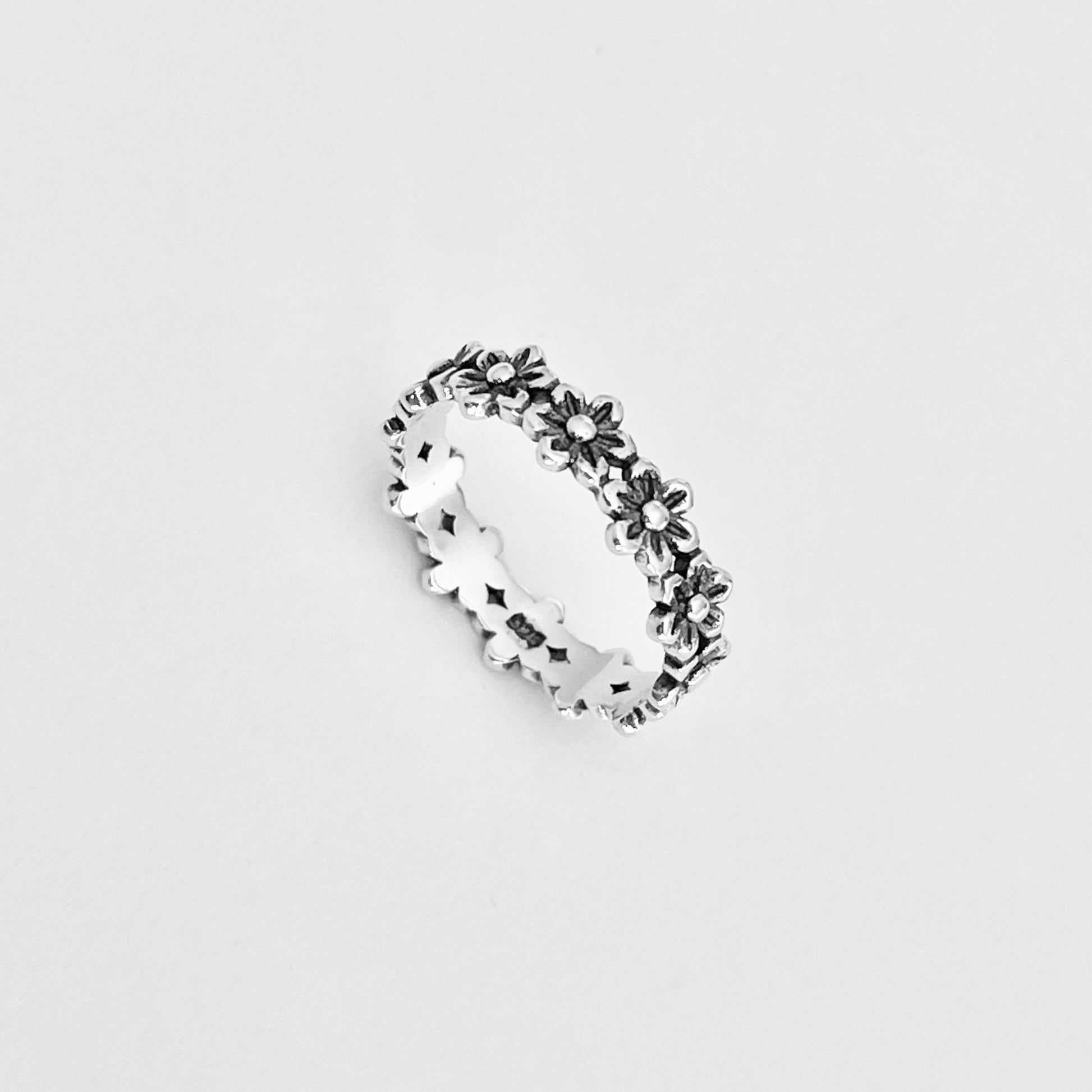 Add a touch of floral elegance to your collection — shop the Sterling Silver Eternity Flower Band today.