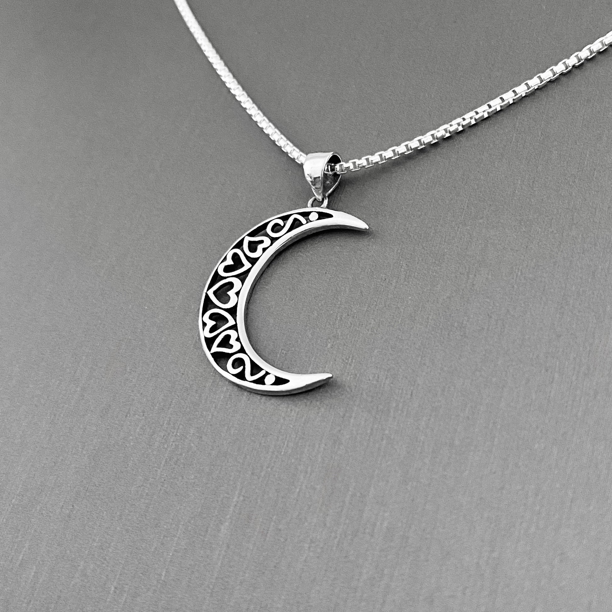 925 Sterling Silver Crescent Moon Hearts Necklace | Celestial & Love Jewelry