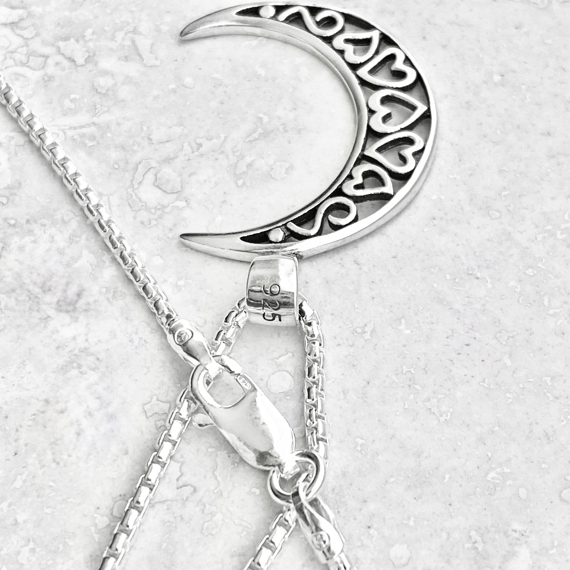 Capture the magic of the night sky with our 925 Sterling Silver Crescent Moon Hearts Necklace. Featuring a large crescent moon adorned with delicate hearts, this pendant combines celestial beauty with a touch of romance, making it a perfect statement piece for everyday wear or special occasions.