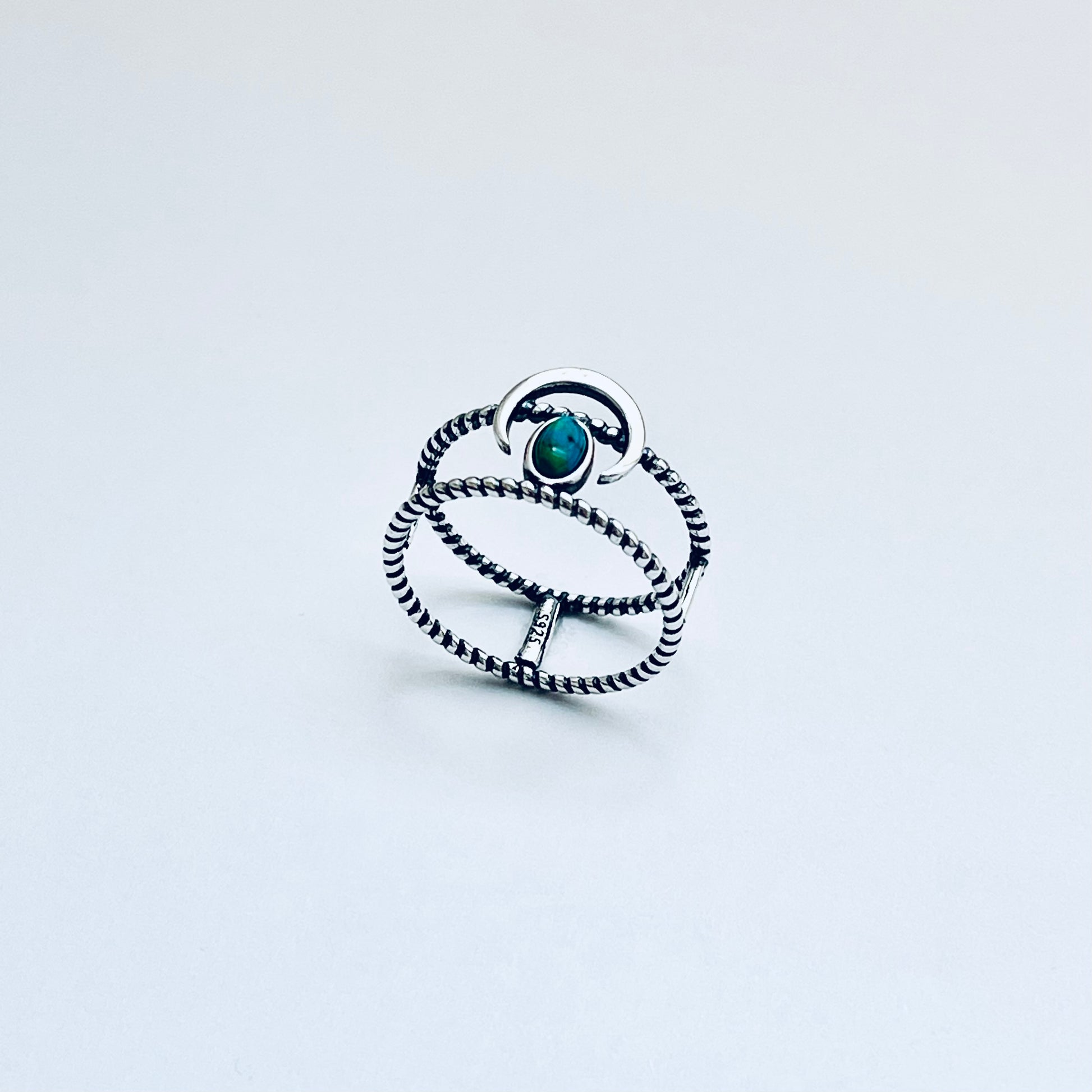Sterling Silver Rope Caged Band with Crescent Moon and Turquoise Ring, Celestial Jewelry