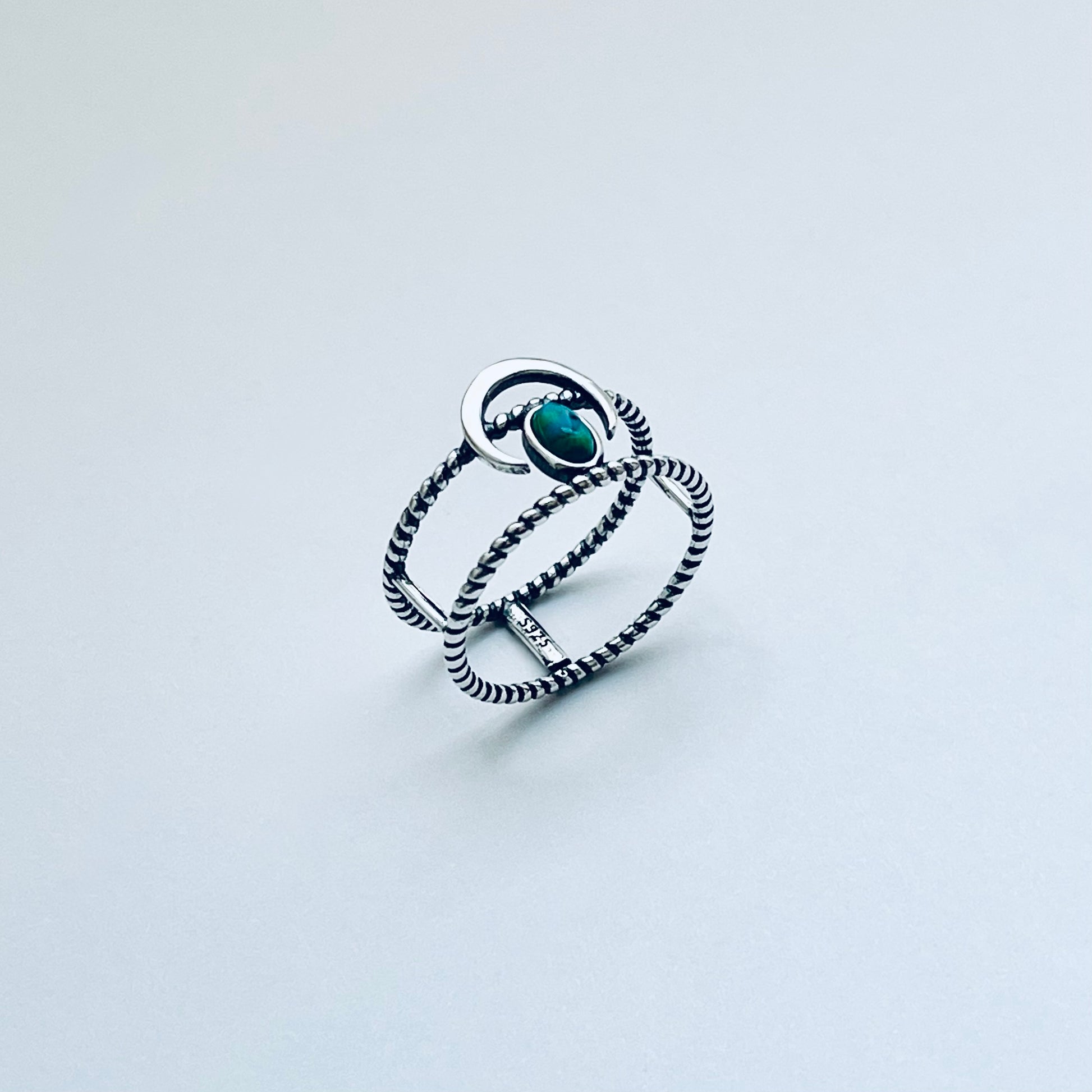 Sterling Silver Little Oval Genuine Turquoise and Crescent Moon Ring with Rope Caged Band, Delicate Rings, Dainty Celestial Jewelry, 925 Stamped