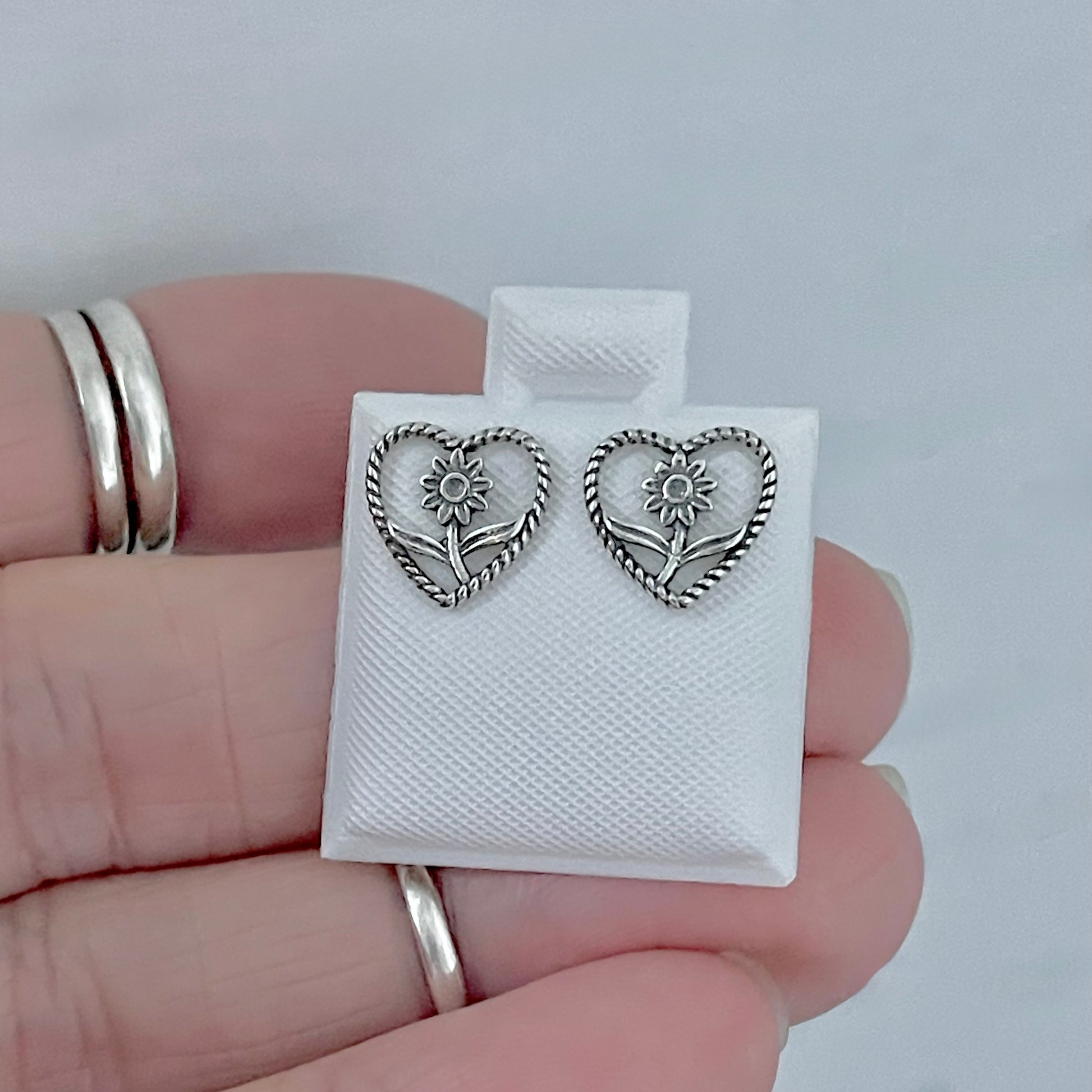 925 Sterling Silver Rope Heart Daisy Stud Earrings | Flower & Love Heart Silver Earrings