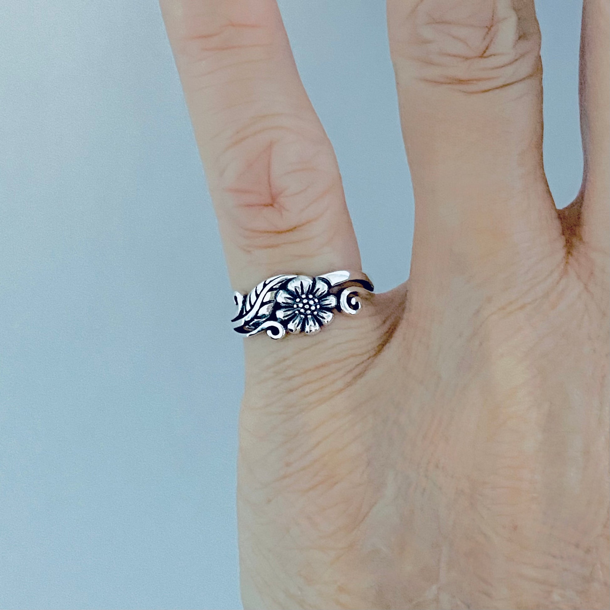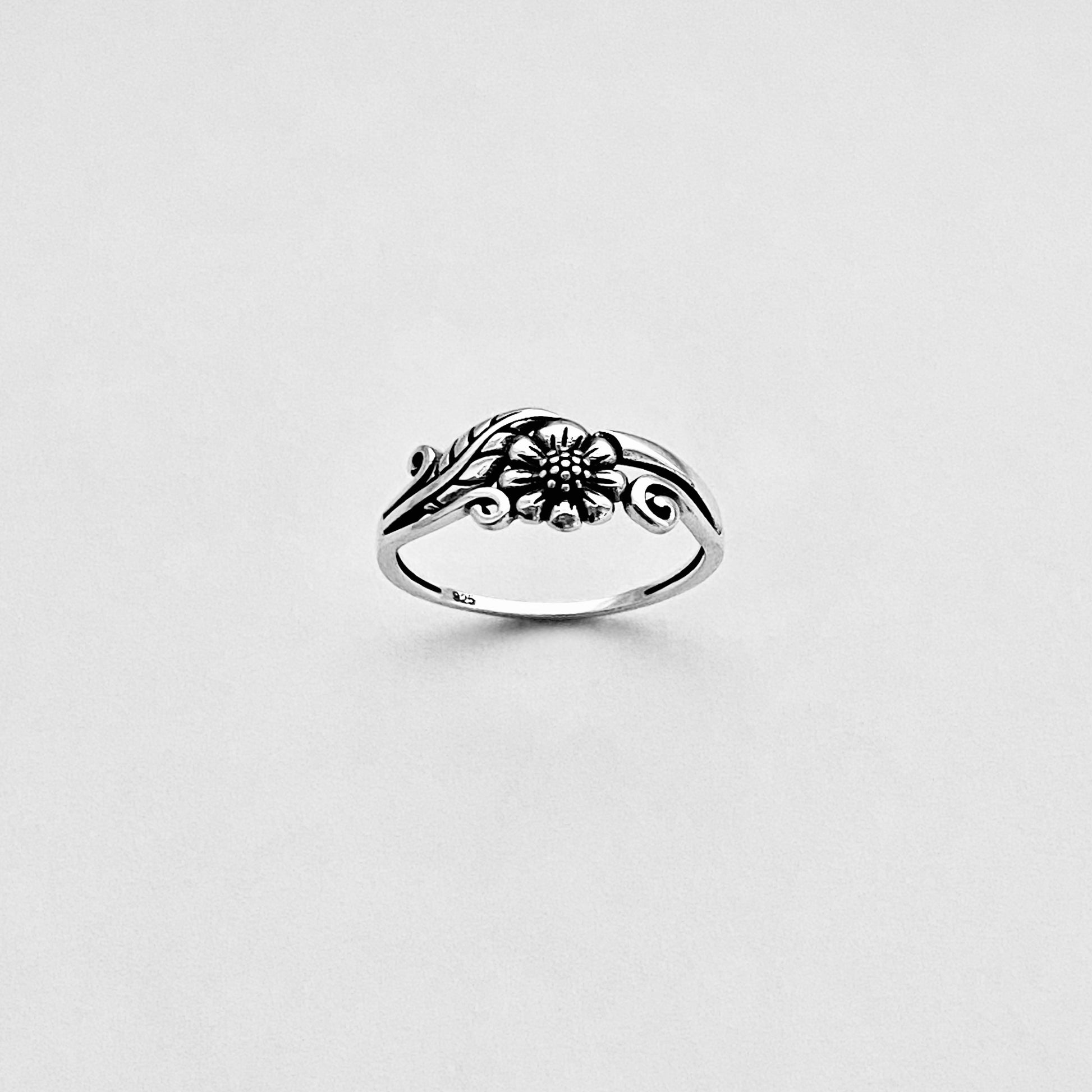 Sterling Silver Small Dainty Sunflower Ring with Leaf, Flower Jewelry