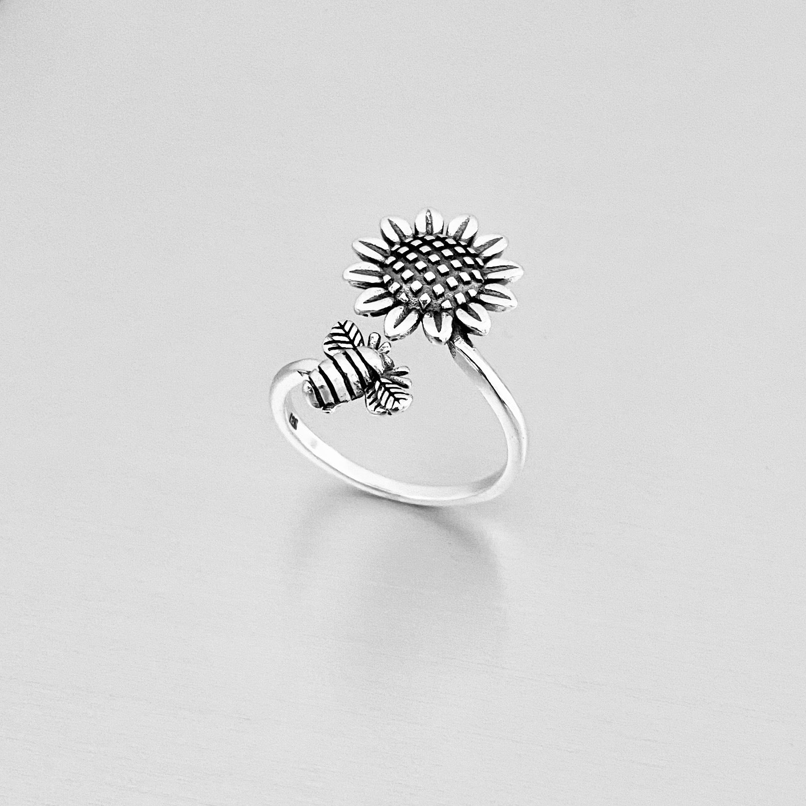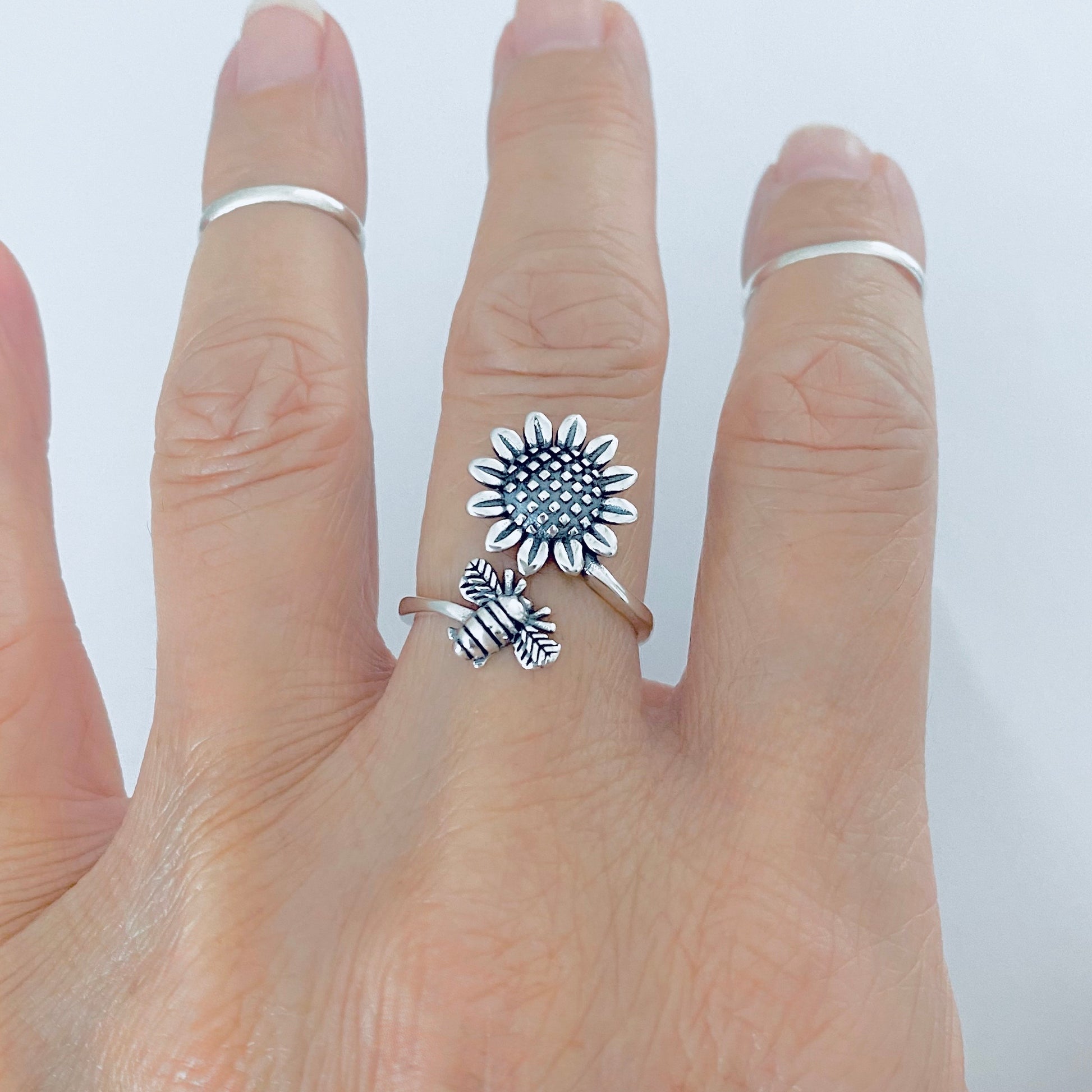Sterling Silver Wraparound Bee and Sunflower Ring, Flower Bug Jewelry, Bumblebee Rings