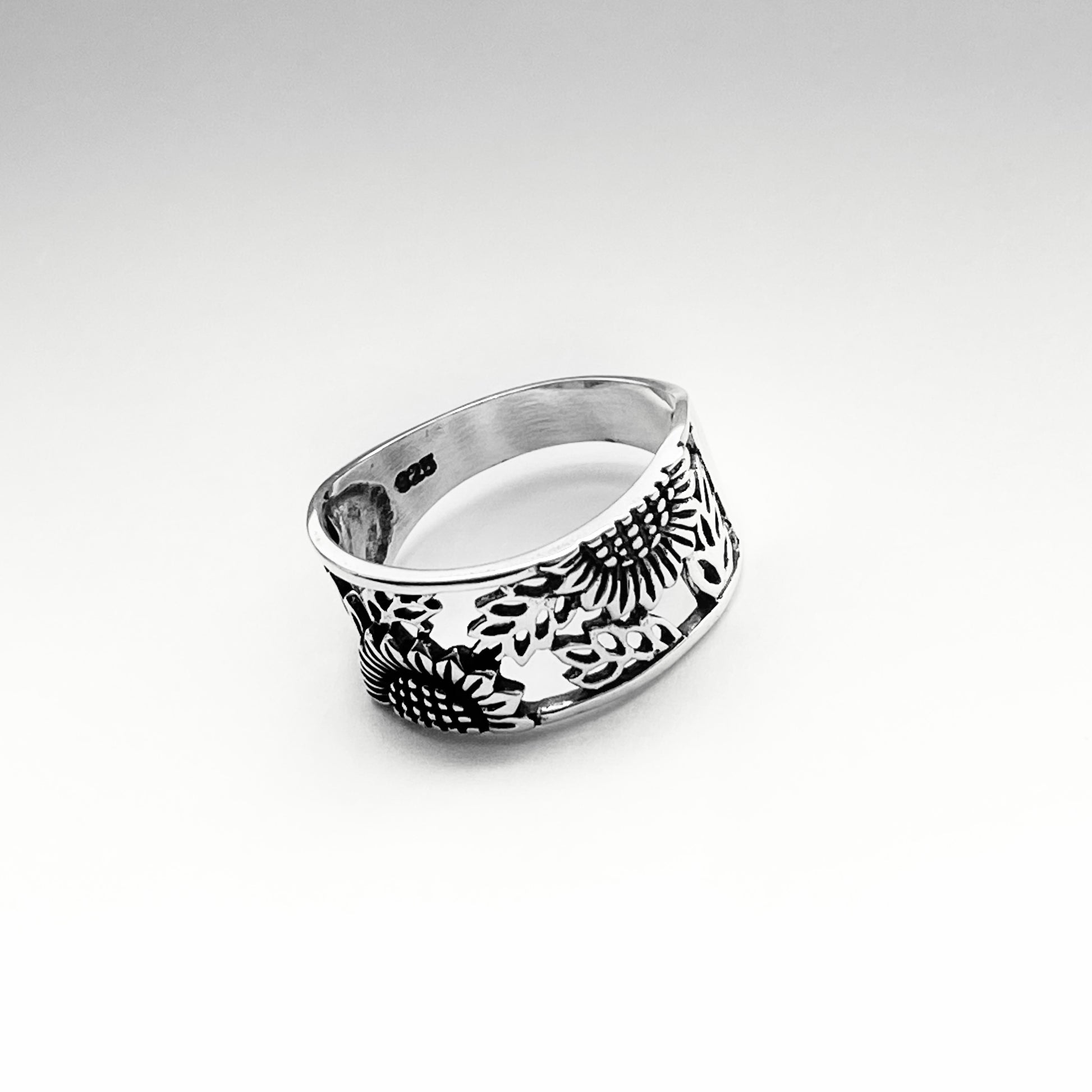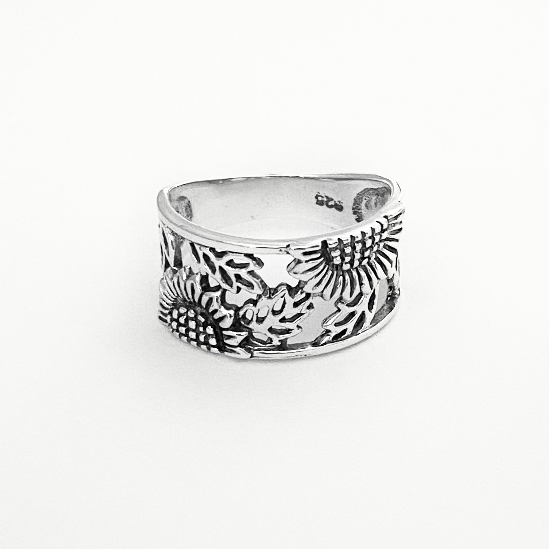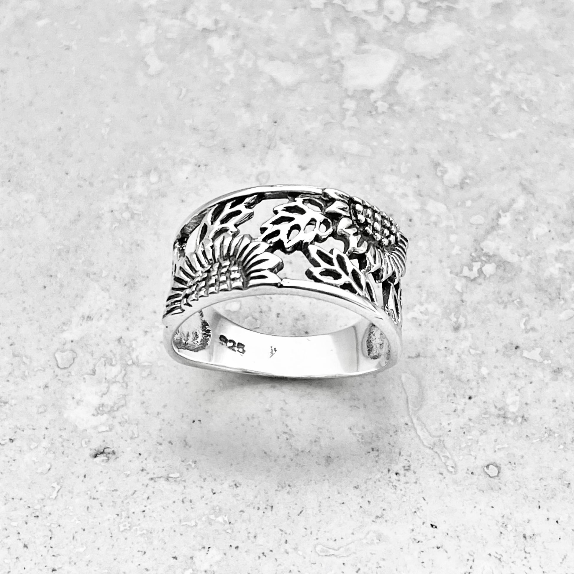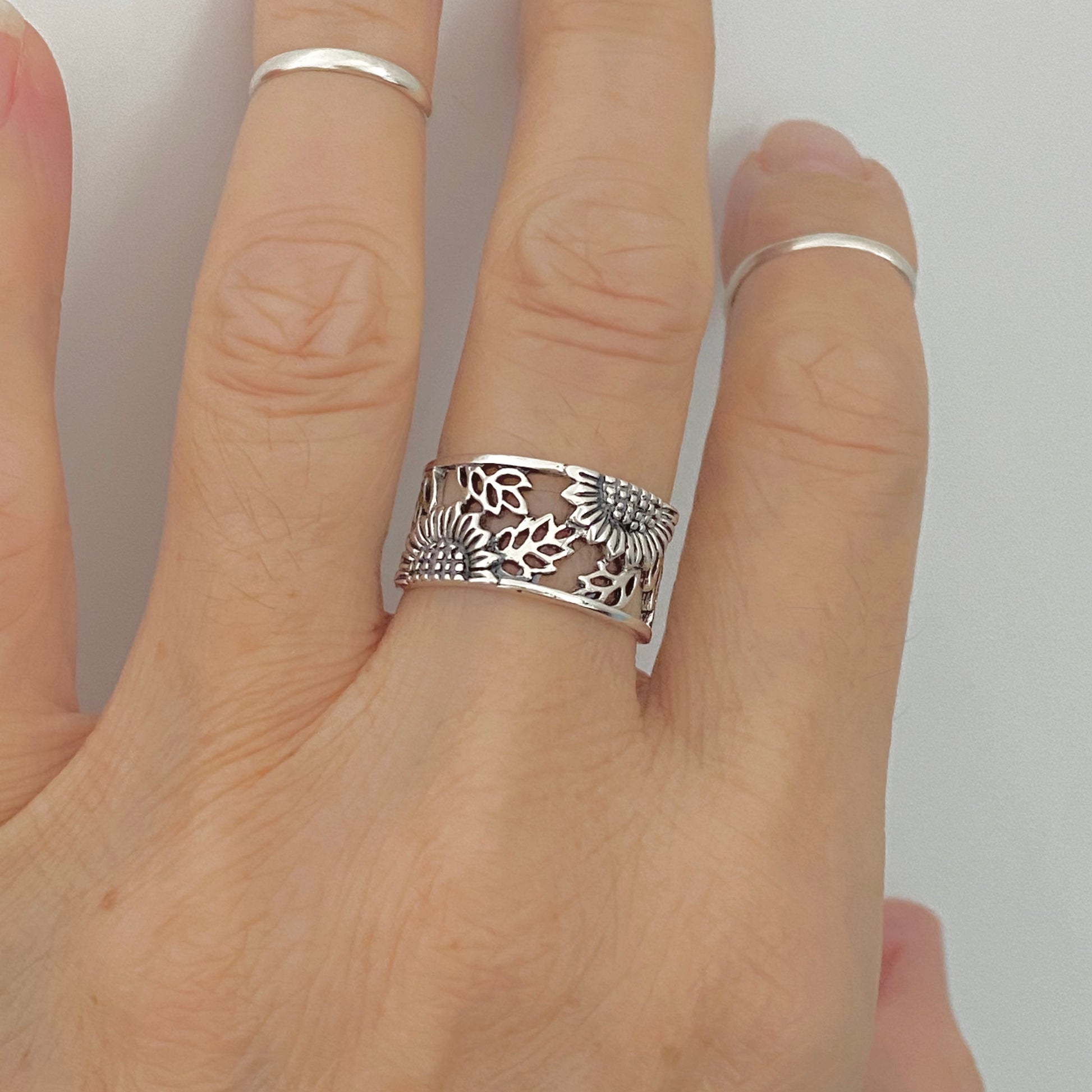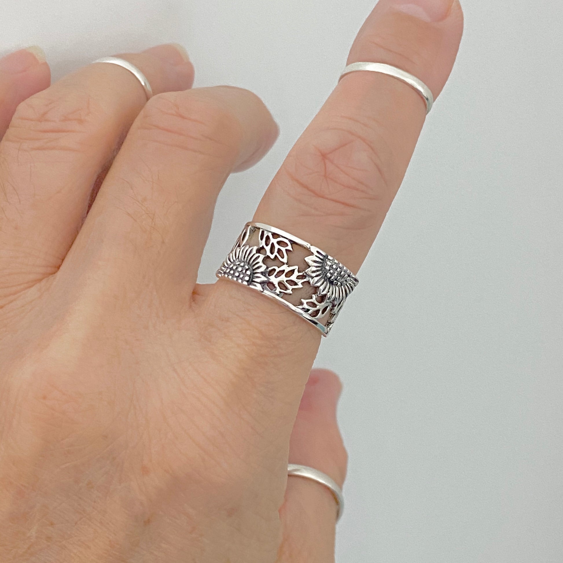 Sterling Silver Sunflower Ring with Leaves, Flower Band, Leaf Rings, Happy Flowers