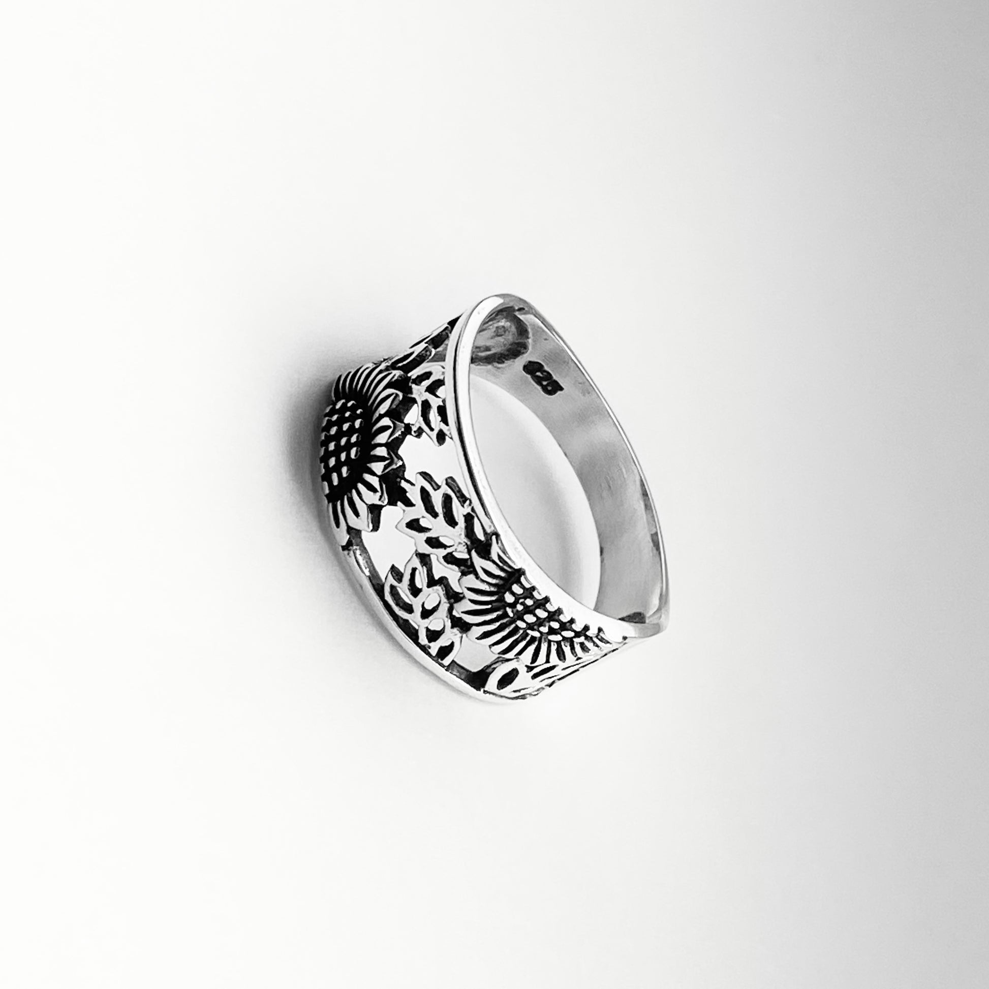 Sterling Silver Sunflower and Leaf Ring, Boho Ring, Flower Ring, Silver Rings, Statement Ring, 925 Stamped