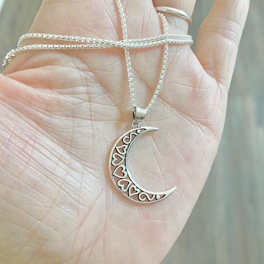 925 Sterling Silver Crescent Moon Hearts Necklace | Celestial & Love Jewelry